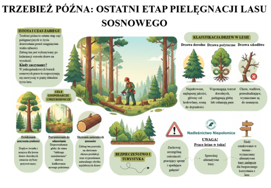 Trzebież późna to jeden z ostatnich zabiegów pielęgnacyjnych w drzewostanie dojrzewającym, w którym usuwa się m. in. drzewa chore, uszkodzone i zbyt gęsto rosnące, poprawiając tym warunki świetlne i przestrzenne dla innych drzew. Są to działania przemyślane i selektywne, dzięki któremu las może się rozwijać w sposób zrównoważony i zdrowy.